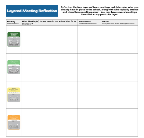 When establishing Collaborative Structures and Processes in schools, it's important to develop a layered approach to responding to the needs of students, as well as ensuring collaborative time for teams. With effective communication strategies in place, each team builds on the work of each layer.