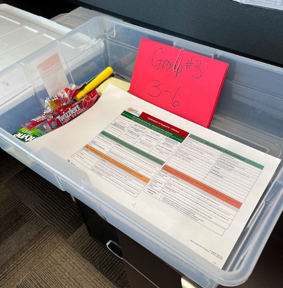 You should never waste precious minutes of collaborative time searching for supplies, which means if your meeting space changes, your resources must be portable. Assemble a "Meeting Bin" or a dedicated book box that travels with the team or is stored in a central location for the organizer to grab. Inside this bin, you should include printed or laminated copies of team norms, continuums of support, and essential supplies like sticky notes, pens, and scrap paper. Including simple role cards for the facilitator, timekeeper, and recorder ensures that the team can start exactly at the designated time and make the best use of every minute. The following photo comes from Light of Christ School where each team had a bin of all the resources they needed for the CTM (including treats and snacks).
