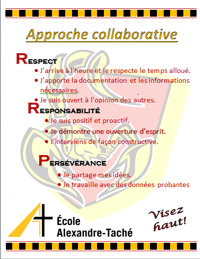 | Modèle des normes d’équipes collaboratives de l’École Alexandre-Taché - Cette équipe a établi les normes de rencontre collaborative selon les valeurs de l’école. | |