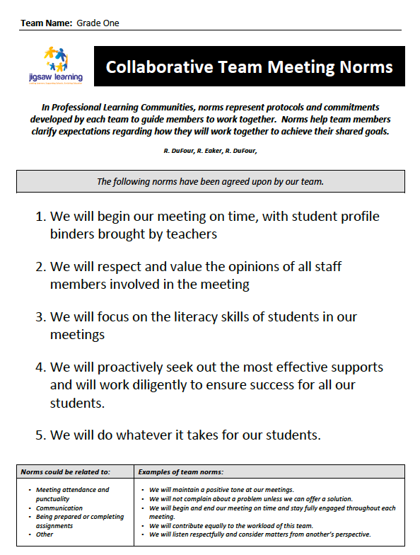 ![]() | Sample Team Norms – Sample set of team norms for a grade one team (specifically establishing norms for a collaborative team meeting) |