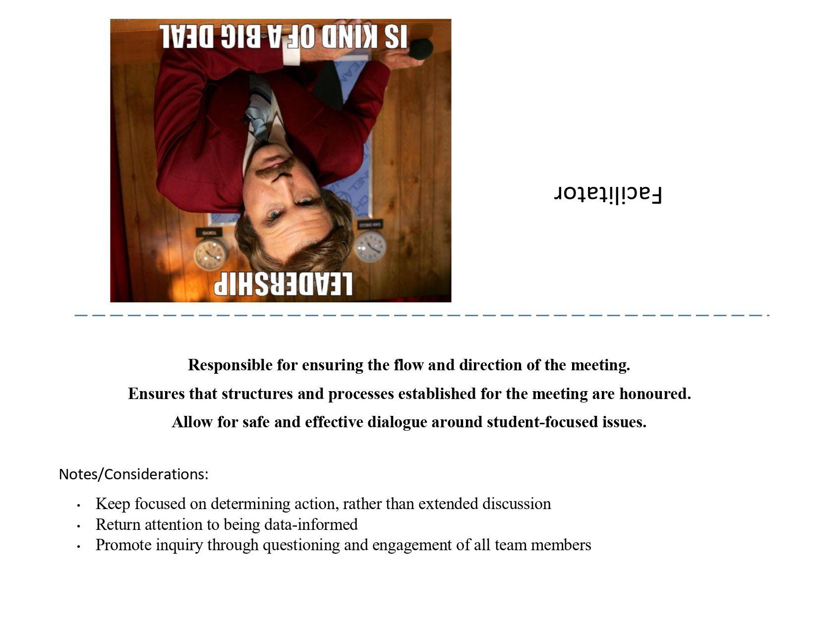 MCHS CTM Agenda Guide - Guide for meeting facilitators at Memorial Composite High School when engaging in collaborative team meetings, with notes regarding steps to take through each section of the agenda. Copyright 2020, C. Jensen - Memorial Composite High School, Parkland School Division, AB. Shared with permission. | |