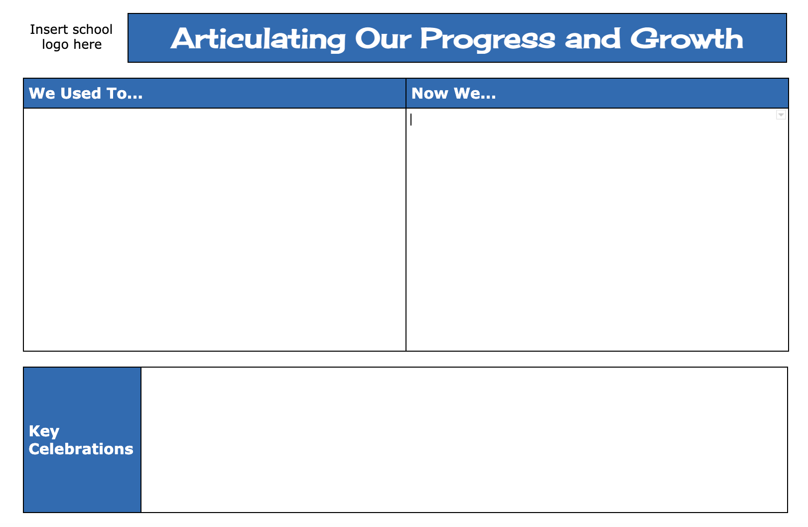 ![]() | Articulating Growth Template - Reflection organizer to be used in a variety of situations, to have staff reflect on shifts in practices across an organization, as well as key celebrations to help in recognizing and articulating growth and progress made. |