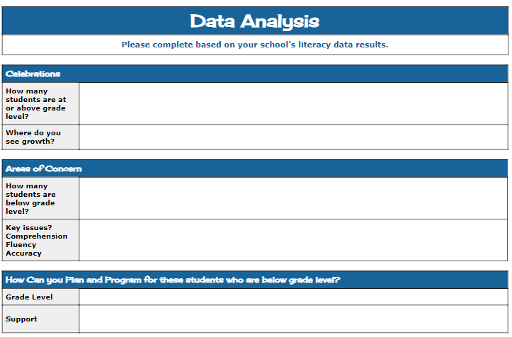| Literacy Data Analysis Template - Use this template to reflect on your class/school literacy data and come to meetings prepared! By identifying students who are at/above grade level, as well as the students who are below grade level expectations, you will be ready to begin the planning process for literacy support. By identifying areas of weakness such as; comprehension, fluency or accuracy, and giving some thought to planning for support, you will be well on your way to establishing a literacy support plan for your students. |