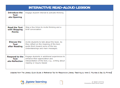 | The Interactive Read Aloud is an important instructional component in any classroom. Use the following template to intentionally plan for this instructional context and take your read alouds to the next level. |