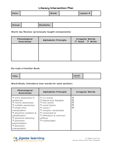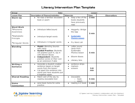 | Literacy Intervention Plan Template - Intervention lessons need to be targeted & timely as we know there is not a moment to waste when supporting our students. Check out this intervention template, and the accompanying sample lesson with description, to see how each section targets key components of early reading from phonological awareness and phonics to shared reading & writing. |