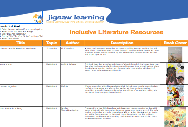| Inclusive Literature Resources - This document highlights many diverse books to further enhance your collection. You’ll find selections for topics such as LGBTQIA2+, physical & mental disabilities, multicultural, social justice and diversity. We hope this resource will assist you as you examine your classroom and school libraries and perhaps offer suggestions for additions to your existing resources. |