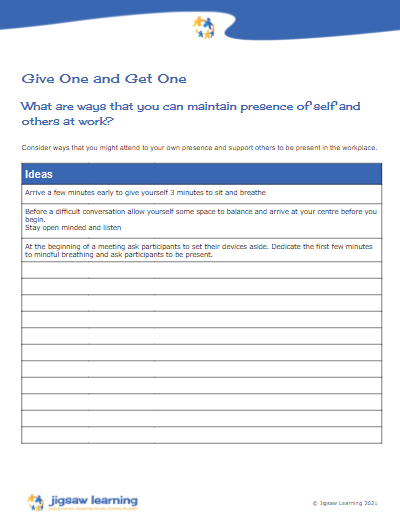 | Give One and Get One - What are ways that you can maintain presence of self and others at work? Provide some examples that work for you and feel free to take away some ideas that will support your work. |