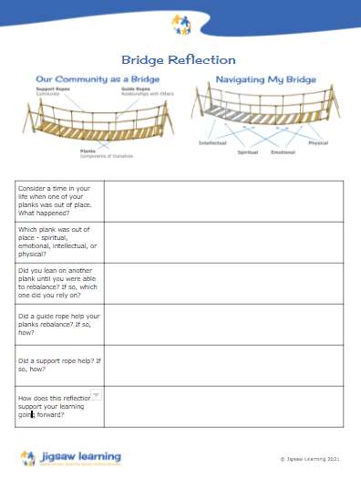 | Bridge Reflection - When considering our personal wellness in terms of a rope bridge, we consider our experiences and circumstances that influence our reactions and how we move through a negative experience to wellness by balancing our bridge. |