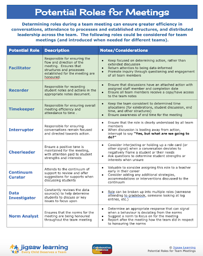 In addition to the role of timekeeper, we would also encourage readers to investigate the function and impact that other intentional roles may have in creating a culture of collaboration. As with the role of timekeeper, the role of facilitator, note keeper, norms analyst and more, when initially introduced are mechanical but can effectively form positive habits that enhance collaboration. The following list provides examples of possible roles: