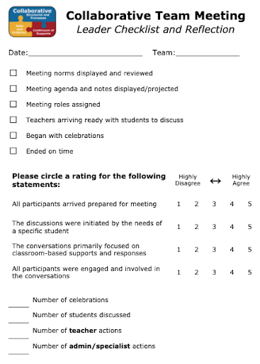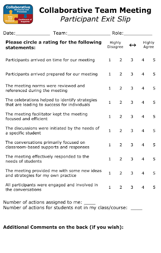 Exit slips, as tools for reflection, are an effective means of gauging the success of collaborative team meetings. The leader and all participants could use these slips to reflect on the meeting's effectiveness, identify areas for improvement, and inform the timing of the next steps. The following templates provide examples of exit slips that could be used to assist with gathering feedback in terms of success of the collaborative team meeting.