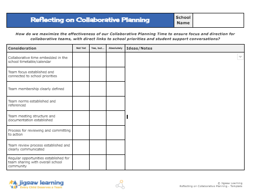 When considering the implementation of collaborative planning teams, team planning guides can be used to provide a one-stop resource that documents their goals, team norms, current reality as well as notes on the progress made. The planning guides also serve to create a process of regular support from school leaders to document progress as well as provide an opportunity to share their learning with other teams across the school. The following team planning guides function on action research to encourage reflection and progress as well as next steps: Action Research Team Planning Guide template (Goal), Action Research Team Planning Guide template (Inquiry Question)