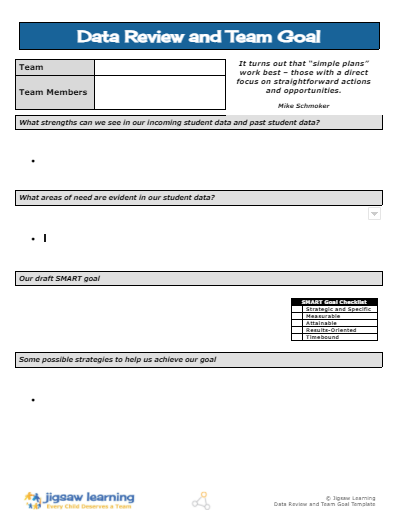 When an area of focus is established, the collaborative planning teams begin with an examination of their data to explore strengths, challenges and possible areas to target that require new learning or enhancement. This Data Review and Team Goal template provides guidance in establishing SMART goals to guide the team. This Data Review and Inquiry Question template provides guidance when teams formulate their goals around an inquiry question. Both methods focus on creating a goal derived from their data to guide their learning in collaborative planning teams.