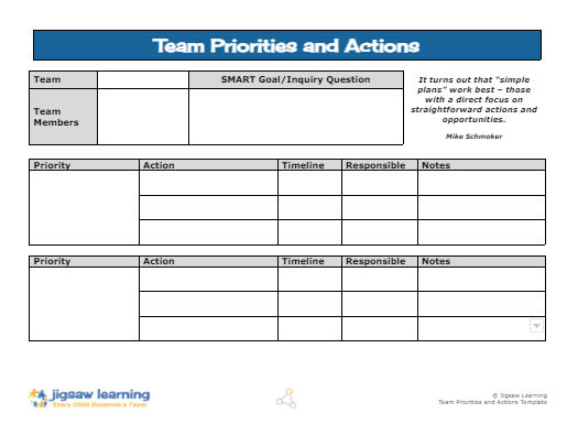 Once the team time is established and the goals have been created, teams will convene according to their schedule and develop priorities related to their goal or inquiry question. A simple planning tool can support their ongoing work by documenting actions including timelines and responsibilities.