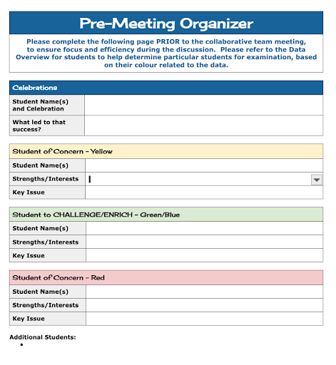 Another direct impact color coding has on Collaborative Team Meetings, is the adjustment in the pre-meeting organizer to encourage team members to examine their data in order to identify students for discussion. This template encourages teams to identify students who are in the yellow for initial discussion in the key issues process followed by a student in the green or blue (excelling) and then finally a student in the red for a brief review of supports and possible transition to the School Support Team. As part of the process for preparing for Collaborative Team Meetings, we have now ensured a direct application for the review of data prior to the meeting to ensure we are talking about the right students in the right meeting.