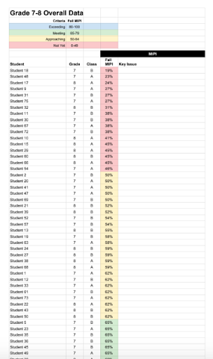 As seen below, this grade 7-8 overall data has been organized and sorted to show the cohort of students who will be considered in a collaborative team meeting. At the top of the sample, this school has identified criteria to establish the color coding and the sample is sorted according to the criteria. As you may notice, in this arrangement students are not in alphabetical order as the data has been sorted to focus on current scores and sorted into the color groups according to the criteria stated at the top. Sometimes, a norm referenced publishers assessment will determine this criteria and establish the color coding and sometimes schools need to set the criteria for their data and evidence and encourage teachers to apply these criteria while entering or reviewing data.