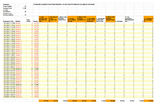 The following visual provides an example of numeracy data reviewed for the purpose of collaborative planning. Students are arranged in alphabetical order and the primary focus now becomes the overall responses provided by students and determining if there is a question or task that a significant number of students were challenged by. Reflecting on this analysis, teachers color code the areas of concern. Our response then becomes two fold, we examine the question to see if there is a significant flaw in the assessment tool or we design strategies to increase students' understanding in that particular identified area.