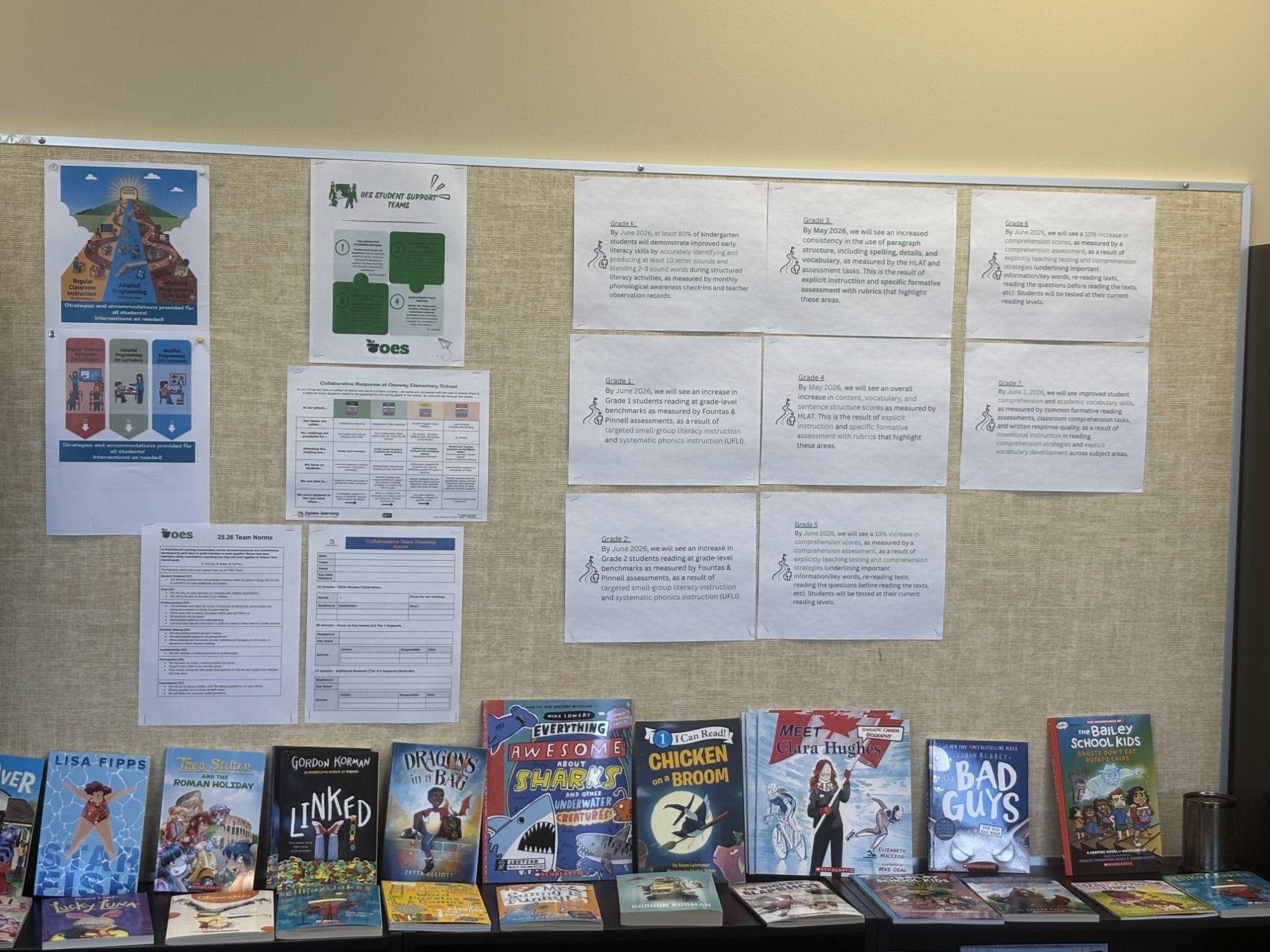 ![]() | Onoway Elementary Meeting Room - a number of photos from their school's team meeting space, with various meeting anchor charts, artifacts, and an overview of every team's goal. Copyright 2026, M. Dickner - Onoway Elementary School, Northern Gateway Public Schools, AB. Shared with permission. |