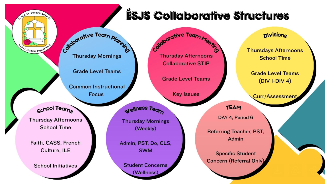| Collaborative Structures Overview - overview of the different types of team meetings at École St. Joseph School, including when, who and focus. Copyright 2026, A. Larade - École St. Joseph School, Yellowknife Catholic Schools, NWT. Shared with permission. |