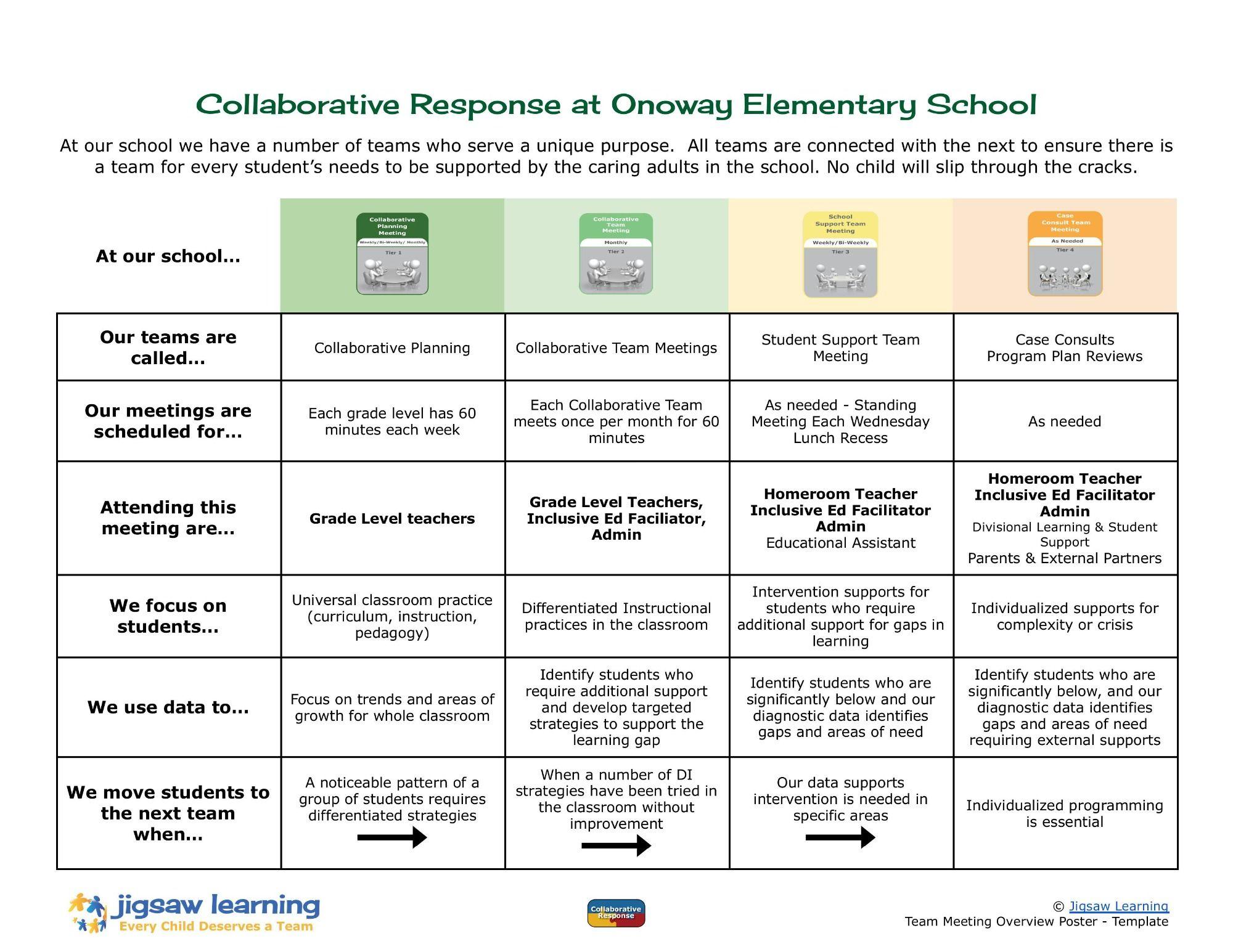 ![]() | Onoway Elementary Team Meeting Overview - a poster detailing the teams at Onoway Elementary School, including their meeting times, members, and the purpose and student movement for each meeting layer. They have also developed a public facing overview of these teams for sharing on their school website and with families. Copyright 2026, M. Dickner - Onoway Elementary School, Northern Gateway Public Schools, AB. Shared with permission. |